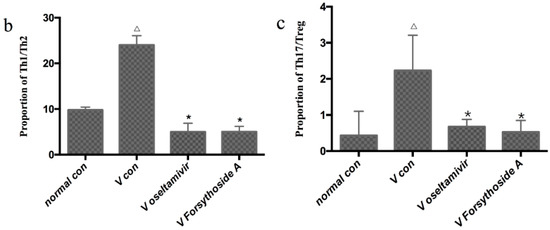 Flow cytometry was used to detect the proportion of the T cell subsets Th1/Th2 and Th17/Treg. (a) Flow cytometry analysis of CD4+ T cell subsets; (b,c) Changes in the proportion of Th1/Th2 cells and Th17/Treg cells. Δ p < 0.01 compared with normal con. * p < 0.01 compared with V con.