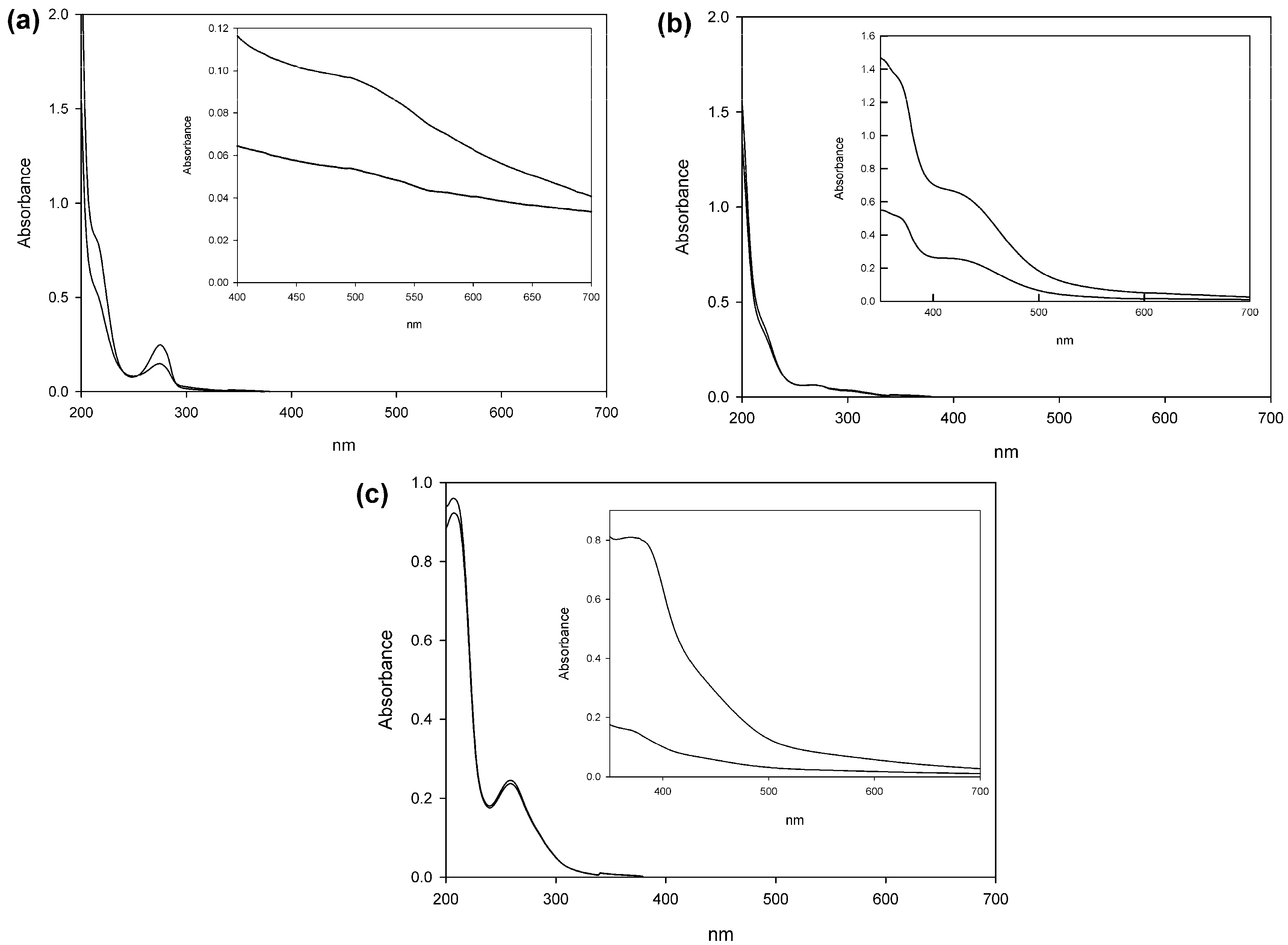 UV-Vis spectra of polymerization or dimerization products with catechol (a); pyrogallol (b); and gallic acid (c) as starting monomers. Grey lines represent the control reactions where laccase was substituted with heat-inactivated enzyme, while black lines represent the reaction mixtures after 24 h. The UV-Vis spectra presented correspond to 100-fold diluted samples, while in the inlets the spectra were recorded without any dilution.