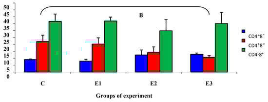Statistically significant differences (p ≤ 0.05) were noted in the subpopulation of CD4+8+ cells. Differences were observed between group C and group E3 in week 5 (Figure 1).