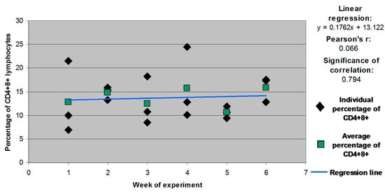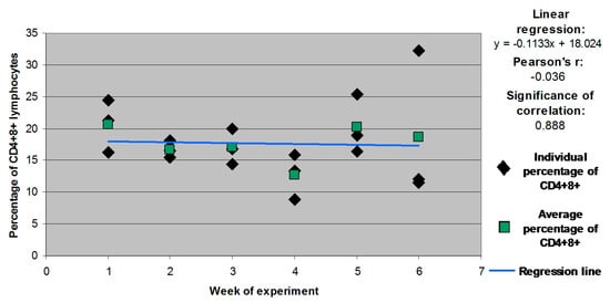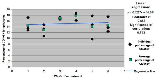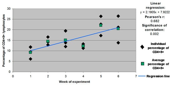 Statistically significant differences (p ≤ 0.05) in CD4+8+ counts were also found in group C between week 1 and weeks 5 and 6. A significant correlation was observed between the size of the CD4+8+ subpopulation and the animals’ age in group C. The correlation coefficient was determined at r = 0.682 at a significance level of p = 0.002 (Figure 2).