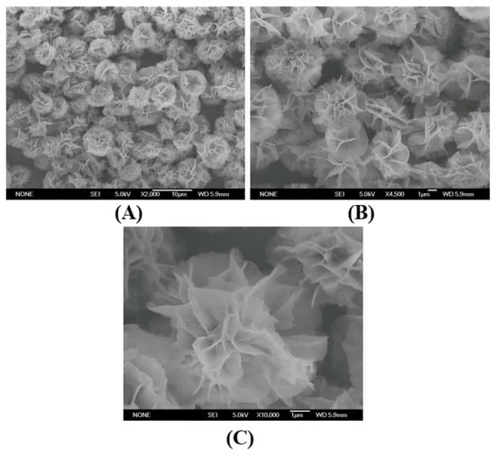 A large number of immobilized APE1547 have been successfully prepared (Figure 1A,B). The shape of the immobilized enzyme looked like a natural flower, with dozens of separate petals with high surface (Figure 1C). Its diameter was about 4–5 μm. The excellent hierarchical structure with high surface to volume ratios is likely to improve the enzyme performance of the immobilized enzyme.