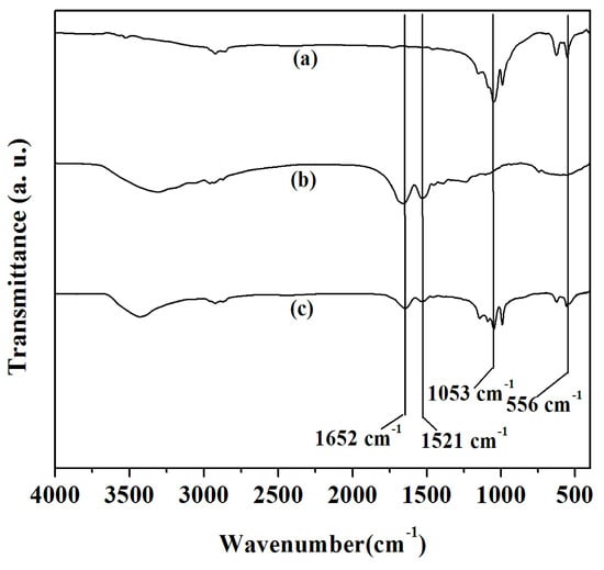 The FTIR spectra of the immobilized samples were recorded and the results are shown in Figure 2. Several characteristic peaks could be observed in curve c. Among of them, the peaks at 1053 cm−1 and 556 cm−1 are assigned to the vibrations of PO43− [19]. The peaks at 1652 cm−1 and 1521 cm−1 are ascribed to the vibrations of the amide I and II bands of the enzyme [20]. These results successfully verified the presence of enzyme in the immobilized samples.