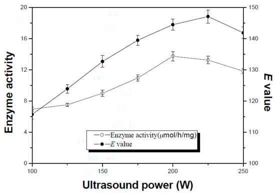 The effect of ultrasound power on the enantioselective esterification was examined and the results are shown in Figure 3. The highest enantioselectivity was obtained at an ultrasound power of 225 W and the maximum enzyme activity could be observed at 200 W. The enhancement of enzyme activity obtained at suitable ultrasound power (225 W) was probably attributed to the better mixing of the reactants [21]. Furthermore, the improvement of the mass transfer processes in the nanobioreactor can also increase the enzyme activity considering the complexity and heterogeneity of the immobilized enzyme. However, the mechanism for the ultrasound-induced alteration in the enantioselectivity is still unclear. Our previous study has demonstrated that ultrasound can induce a slight change of the secondary structure of APE1547 and then influence its enantioselectivity [7]. Further research is needed to clarify the mechanism and will be published in due course.
