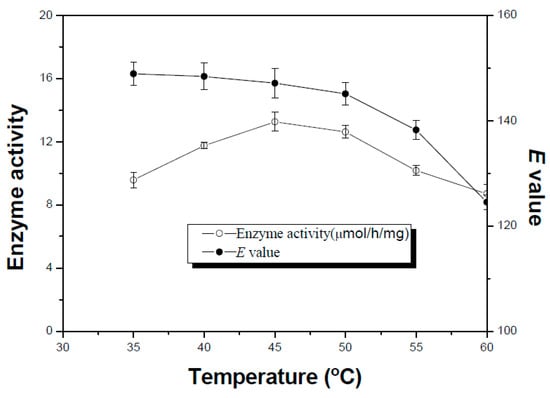 The effects of ultrasound temperature on the enzyme performance have also been investigated in this study. The result in Figure 4 showed that higher enantioselectivity could be obtained at lower temperature. The possible explanation is that high temperature may destroy the conformation of the enzyme by heat-induced destruction of non-covalent interactions and decrease the enantioselectivity [22,23]. The enzyme activity exhibited a bell shaped curve with the changing ultrasound temperature, and the optimal temperature was 45 °C.