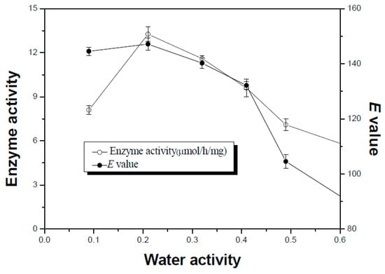 Water may influence the performance of the enzymes in organic solvents [24]. The results in Figure 5 showed that the enzyme activity increased as water activity increased from 0.09 to 0.21, then decreased at higher water activity. The maximum enantioselectivity (E value) could also be observed at aw = 0.21. Water activity may influence the reaction rates of the two isomers and then induce the alteration of enantioselectivity of APE1547 [24]. Since the E value (147.1) was found to be highest at aw =0.21 while maintaining the highest enzyme activity (13.26 μmol/h/mg), the water activity of 0.21 was selected for further study.