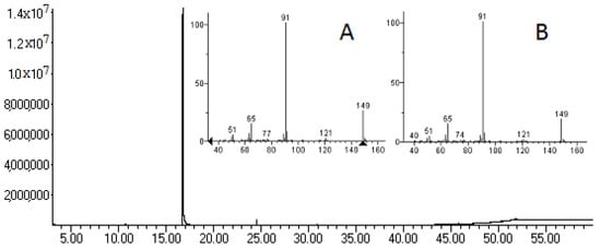 GC-MS chromatogram from the essential oil (EO) of T. pentaphyllum tubers, with mass spectra of benzyl isothiocyanate (BITC) standard from National Institute of Standards and Technology (NIST) library (A) and from peak with retention time of 16.76 min (B).