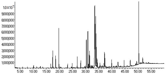 The most active tested samples in the antimicrobial activity evaluation were the EO and the CfF, as presented above, and therefore these were submitted to gas chromatography-mass spectrometry (GC-MS) analysis. The chromatograms are shown in Figure 1 and Figure 2. Table 4 complements Figure 2, presenting the composition of the CfF according to the peaks shown in the chromatogram.