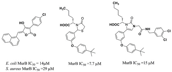 Uridine diphosphate UDP-N-Acetylenolpyruvylglucosamine reductase (Mur) enzymes are integral components in bacterial peptidoglycan biosynthesis that provide valuable targets for specific bacterial cell wall inhibitors. There is a growing interest in MurB inhibitors, as it is essential for the viability of bacterial cells without any homologue in eukaryotic cells. A variety of MurB small molecule inhibitors with antibacterial activity have already been reported (Figure 1) [7]. Substituted 4-thiazolidinones and their analogues working as MurB inhibitors have received great attention. Trisubstituted 4-thiazolidinones inhibited the Escherichia coli MurB enzyme at a low micromolar level, most probably acting as diphosphate surrogates for the natural substrate (Figure 1) [8]. The related imidazolidinone also inhibited MurB enzyme, showing good antibacterial activity (Figure 1) [9].