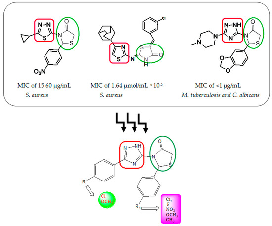The SAR of the antibacterial activity of the 1,3-thiazolidin-4-one scaffold has become the subject of intense research projects [10,11]. Exploration of the 1,3-thiazolidin-4-ones showed that their antibacterial activity not only depended on the 1,3-thiazolidin-4-one pharmacophore, but also on the nature and position of its substituents; for example, electron withdrawing group substitutions on aromatic rings of biphenyl-4-thiazolidinone derivatives showed improved antibacterial activity [11]. Numerous new derivatives with the pharmacophoric 4-thiazolidinone ring were substituted with five-membered heterocyclic rings, [12] such as thiadiazole, [13] thiazoles [14] or 1,2,4-triazoles [15], as seen in Figure 2. Moreover, 1,2,4-triazoles are core structures in medicinal chemistry research with diverse biological activities [16,17,18].