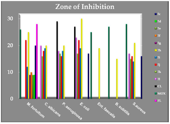 Graphical representation of the zone of inhibition (mm) of the compounds (7c–l) and reference antimicrobial drugs against different bacterial and fungal strains.