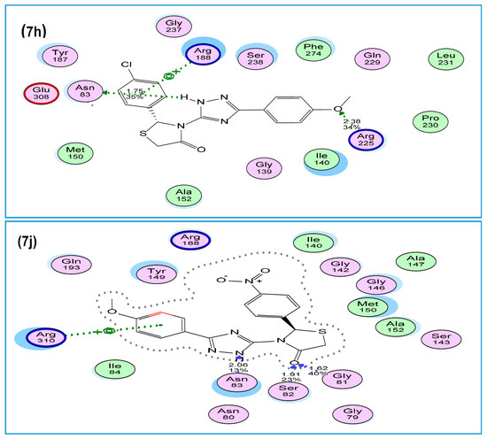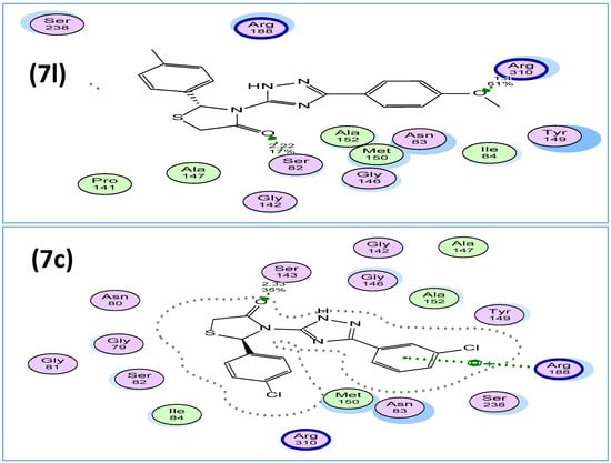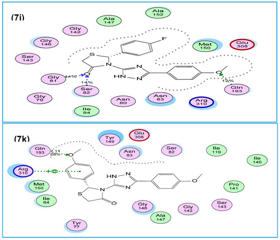 The synthesized compounds were docked into the binding site of the MurB enzyme pocket and will be presented according to their better MIC values; however, there was a lack of accordance with matching MIC, which is logical, since the MIC is complex and unrelated to specific inhibition to any target enzyme. Modeling studies suggest that Compound 7h binds to the MurB active site with a binding affinity of −12.18234 Kcal/mol via the hydrogen bonding interaction of the NH of triazole ring group with Asn83 with (36%, 1.75 Å) and Arg225 with the oxygen of methoxy group with (34% 2.38 Å), while it also shows cationic-arene interaction with the Arg188 residue (Figure 4). Compound 7j showed a hydrogen bond interaction network with a triad of amino acids Asn83 (13%, 2.06 Å), Ser82 (23%, 1.91 Å) and Gly81 (40%, 1.61 Å) via the NH group of the triazole ring and the carbonyl group of the thiazolidine ring, respectively, with a binding affinity of −12.81985 Kcal/mol; in addition to a cationic arene interaction with the aromatic ring with the Arg310 amino acid (Figure 4). Compound 7l has a binding affinity of −12.42222 Kcal/mol through the hydrogen bond interaction of (61%, 1.4 Å) and (17%, 2.22 Å) with Arg310 and Ser82 via methoxy oxygen and the carbonyl group of the thiazolidine ring, respectively (Figure 5). Compound 7c gives two kinds of interactions: one is the hydrogen bonding interaction of (35%, 2.32 Å) with the Ser143 amino acid; the second is a cationic arene interaction with Arg188 (Figure 5) with a binding affinity of −11.64368, while Compound 7i showed a triad hydrogen bonding interaction with Gly81, Ser82 and Gln193 with 44%, 14% and 12%, respectively (Figure 6).