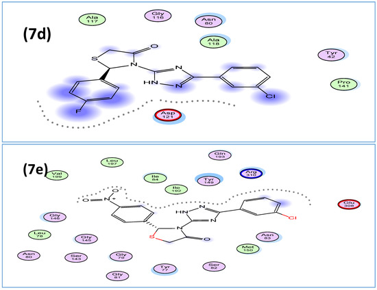 2D binding mode interaction and residues involved in the recognition of the non-active Compounds 7d and 7e, into the MurB binding site.