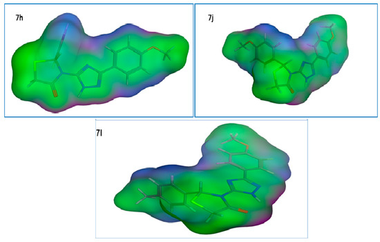 It was reported that the lipophilic characteristic of the previously-tested compounds could play an important role in their binding to the MurB active site [24]. Therefore, it was interesting to perform a deeper investigation of our compounds for the MurB binding site by studying the hydrophobic surface mapping of some tested candidates to get a clue about their lipophilic characteristic, which may imply their binding affinity to the binding pocket. In Figure 8, the surface map of the active site for the selected MurB enzyme along with the docked conformation of Compound 7h are illustrated, showing a higher space of greener areas in the enzyme binding pocket, indicating a highly lipophilic active site. Figure 9 shows the surface mapping of some promising antimicrobials, Compounds 7h, 7j and 7l, where the phenyl group was chosen for its steric and/or hydrophobic interaction with the protein residues. Moreover, the substitution on the phenyl ring of the parent molecule was selected as the hydrogen bond acceptor or hydrogen bond donor to form a bond or to impart hydrophobicity. Figure 8 and Figure 9 are complementary to each other, showing the higher lipophilic characteristics of both active sites and the most promising synthesized candidates that may be responsible for their interaction with the amino acid residues of the enzyme active pocket, especially with the presence of lipophilic moieties, such as the methoxy and chloro groups.