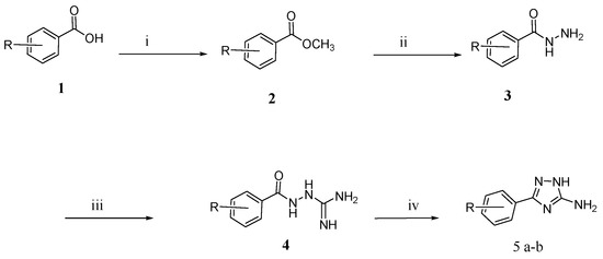 Synthesis of starting compounds (5a,b). Reagents and conditions: (i) HCl gas, methanol; (ii) H2NNH2, absolute ethanol, reflux 5 h; (iii) S-methylisothiourea sulfate; (iv) 5% aqueous NaOH reflux 3 h; neutralize with HCl.