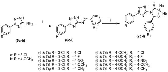 Simple and straightforward synthetic procedures were adopted for the synthesis of our target 4-thiazolidinone derivatives. The key intermediates 3-amino-5-substituted-1,2,4-triazoles 5a–b were synthesized in accordance with the previously-developed chemistry (Scheme 1) [20,21]. Synthesis of 1,3-thiazolidin-4-ones involves three main components: an amine, a carbonyl compound and a mercapto-acid, the synthetic process either prepared in a one-pot three-component condensation [15] or in a two-step process, which we followed (Scheme 2). The reaction pathway involves the in situ formation of intermediate 5-triazolylimines (6c–l) by condensation of the amine and the appropriate aldehydes [22]. The produced imines 6c–l undergo attack by generated sulfur nucleophile when refluxed with mercaptoacetic acid followed by the intramolecular cyclization to yield the substituted 1,3-thiazolidin-4-ones 7c–l. All of the synthesized compounds were characterized by spectroscopic techniques (1H-NMR, 13C-NMR and mass spectra), as well as elemental analyses. The spectral data of the synthesized compounds (7c–l) were in agreement with their proposed structures. The IR data clearly showed a strong C=O stretching band around 1730 cm−1 and 1259 cm−1, which were characteristic for 4-thiazolidinones, in addition to the aromatic C-H absorption band around 3030 cm−1 along with the absence of the characteristic fork-shaped band of the free amino group for 5a–b. The 1H-NMR data indicated the presence of characteristic peaks for 4-thiazolidinone protons of the doublet peak CHb of CH2 around 4.15 ppm and a doublet of the doublet peak for CHa at around 4.08 ppm of CH2 for 4-thiazolidinone. A more downfield doublet peak of the CH proton of the 4-thiazolidinone ring was observed at about 5.6 ppm. Characteristic peaks for aromatic protons appear in their expected range of 6–7 ppm. 13C-NMR of synthesized compounds showed characteristic peaks for carbon 2 and carbon 5 of the thiazolidinone ring at their expected chemical shift δ 34 and 73 ppm, respectively, while its C4 appeared as a downfield signal at around δ 170 ppm.