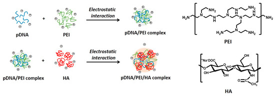 Schematic illustrations for the synthesis of electrostatically self-assembled pDNA/PEI/HA ternary nanocomplexes (pDNA (blue line): plasmid DNA, PEI (green line): polyethylenimine, HA (red line): hyaluronic acid).