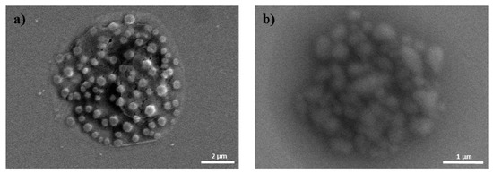 SEM images of (a) pDNA/PEI; and (b) pDNA/PEI/HA (1:8:20).