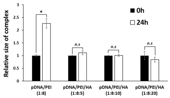 The size stability of each nanocomplex after incubation for 24 h. * p < 0.05, n.s = not significant.
