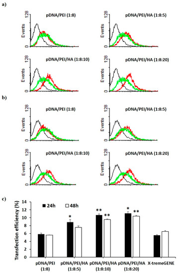 Flow cytometry profiles of non-transfected hASCs (black) and hASCs transfected with pCXLE-EGFP using each nanocomplex (red) and X-tremeGENE (green) (a) at 24 h and (b) 48 h after treatment. Black line = control, red line = complex, green line = X-tremeGENE; (c) Percentage of EGFP-expressing hASCs after transfection by each nanocomplex. Data are presented as means ± S.E. (n = 4), * p < 0.05, ** p < 0.01 vs. X-tremeGENE.