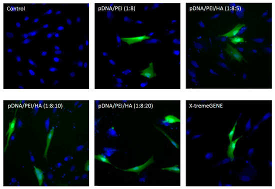 As shown in Figure 6, EGFP expression was higher in hASCs when the plasmid gene was transfected using pDNA/PEI/HA ternary nanocomplexes compared to when pDNA/PEI or X-tremeGENE was used.