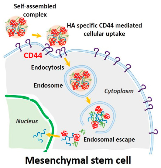 Schematic illustration of CD44-mediated endocytosis and delivery of pDNA into a stem cell using our self-assembled complexes. (Blue line: plasmid DNA, green line: PEI, red line: HA).