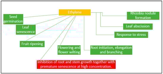 Ethylene is another plant hormone known to regulate many processes such as the ripening of fruits, the abscission of leaves, or the ripening of fruits (Figure 1) [88]. Moreover, at high concentrations, ethylene induces the defoliation and cellular processes that lead to the inhibition of root and stem growth together with premature senescence, all of which lead to poorer crop performance [89]. The plants synthesized 1-aminocyclopropane-1-carboxylate (ACC), which is the precursor for ethylene, in response to exposure to various types of environmental stress, such as cold, drought, flooding, infections with pathogens, and the presence of heavy metals [90]. High levels of ethylene, produced under stress conditions, can halt certain processes such as root elongation or nitrogen fixation in legumes [91], and cause premature senescence [55].