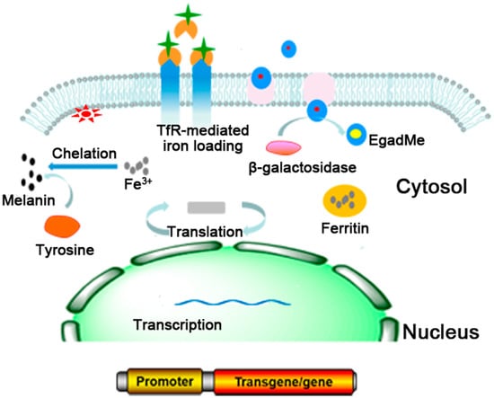 MRI reporter genes can be categorized into three classes based on the types of encoded genes: (1) reporter genes encoding an enzyme (e.g., tyrosinase and β-galactosidase); (2) reporter genes encoding the receptor on the cells (e.g., transferrin receptor (TfR)); and (3) endogenous reporter genes (e.g., ferritin reporter gene). The most commonly used MRI reporter genes include ferritin, TfR, tyrosinase (TYR) and β-galactosidase (Table 1). Ferritin can specifically bind with iron, and thus can be used as MR contrast agent on T2 weighted images (T2WI) [9,10,11]; TfR is highly expressed on the membrane of the target cells that were transferred with TfR reporter gene. Such highly expressed TfR would bring an increased iron uptake in the cells which could result in decreased T2 relaxation time [4,12,13]. LacZ reporter gene expresses β-galactosidase in cells, which cleaves off the galactose group of the substrate and exposes a free coordination site of the gadolinium ion. This reaction leads to increased water proton access to the metal ion, resulting in enhanced inner sphere relaxation and increased MR contrast on T1 weighted images (T1WI) [14]. The TYR reporter gene can be introduced into cells through gene transfer and then expresses tyrosinase in cells which could catalyze the oxidation of tyrosine and dopa and synthesize melanin, which can chelate metal ions (Fe3+) to provide T1 contrast for MRI [15] (Figure 1).