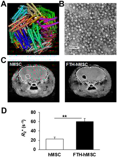 Ferritin reporter gene was used to image human mesenchymal stem cells (hMSCs) by Hoe Suk Kim et al. (A) The structure of ferritin; (B) TEM of ferritin nanocages; (C) In vivo MRI R2* maps of mouse brain transplanted with hMSCs and ferritin reporter gene expressing hMSCs; (D) Bar chart showing the average R2* values measured from in vivo MR images at hMSCs-transplanted sites. Asterisks (**) indicate that the p value showed a statistically significant difference (p ≤ 0.01). Adapted with permission from [39].