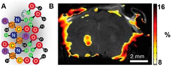 It has been reported that poly-l-lysine has a uniquely high chemical exchange rate, and as a new class of contrast agent, it can be exploited in the chemical exchange saturation transfer (CEST) mechanism to enable detection of dilute solutes [61,62,63,64]. CEST agents are new MRI contrast agents to image a variety of physiological parameters such as pH [65], metabolites, and various diseases (tumor [66,67], and ischemic stroke [68]). The mechanism of CEST is that the exchangeable protons have a chemical shift distinct from water and these protons are selectively saturated. The saturation is transferred to the bulk water via chemical exchange. Briefly, following selective radio frequency (RF) irradiation, mobile solute protons are saturated and exchange with the surrounding water molecules to decrease bulk water signal. This RF irradiation allows CEST imaging to be switchable and with the ability of changing the image contrast “on” and “off” via an RF pre-saturation pulse agents.
