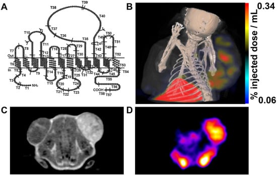 Oatp1 expression was detected using MRI and SPECT by Drs. Patrick and Xiao et al. (A) Predicted structure of oatp1a1; (B) SPECT-CT image of 111In-EOB-DTPA injected mouse. The xenograft on the left flank was a control and the xenograft on the right flank expressed Oatp1; (C) T1-weighted MR image of Gd-EOB-DTPA injected mouse; (D) SPECT image of the 111In-EOB-DTPA injected mouse [79,85].
