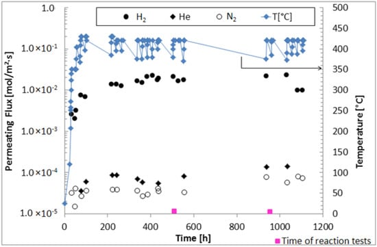 Table 2. Permeation test results after 1100 h of composite membrane under continuous operation at 420 °C.