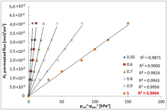 In the range 400–1000 h, when the membrane showed constant properties in terms of hydrogen permeating flux and ideal selectivities, in order to define the correct value of n, a series of hydrogen permeation tests was performed at different transmembrane pressures to calculate the linear regression factor (R2) at different “n”. As illustrated in Figure 3, the highest value of R2 was reached at n = 1, meaning that the permeation characteristics of the composite membrane are far from the Sieverts–Fick law [4], and, meanwhile, confirming a considerable presence of defects as pin-holes in the Pd-Au layer.