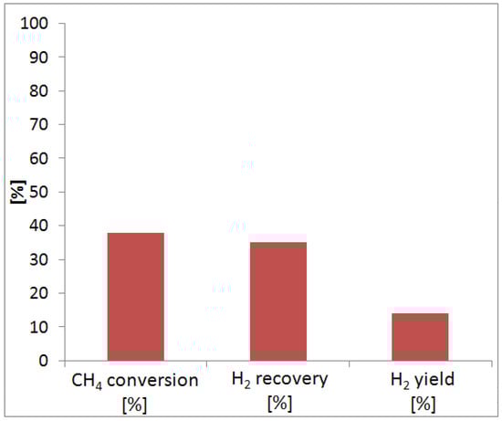 Table 4 resumes the operating conditions of MSR reaction, and Figure 4 sketches the reaction results in terms of methane conversion, hydrogen recovery and yield.