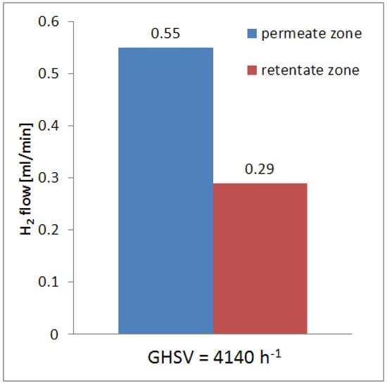 Furthermore, owing to a low value of hydrogen perm-selectivity the effect of the conversion shifting is not so much effective compared to dense Pd-based membranes, full hydrogen perm-selective. As a consequence, the hydrogen yield is also low as well as the hydrogen recovered in the permeated stream. Furthermore, as shown in Figure 5, the total hydrogen produced during the reaction was 0.84 mL/min, subdivided in the hydrogen in the permeate and retentate streams.