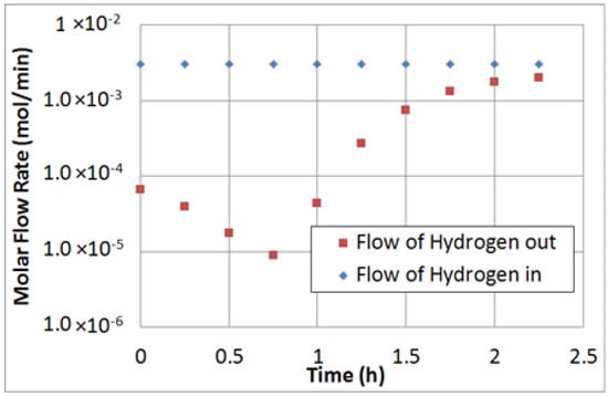 Figure 6. Molar flow rate of H2 in and out of the MR during coke deposition analysis.