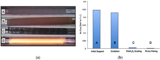 Figure 8. (a) fabrication Steps: [A] Initial support [B] Oxidation at 500 °C [C] Grading [D] Final Pd-Au metallic layer; (b) He permeating flux during membrane progress (Δp = 1 bar, T = 25 °C).