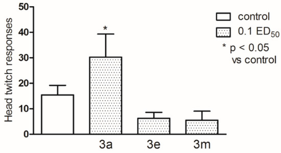 Effect of compounds 3a, 3e and 3m on ‘head-twitch’ responses evoked by l-5-HTP (230 mg/kg) is presented in Figure 1. One-way ANOVA showed significant changes in the number of HTR (F(3,31) = 4.328; p < 0.05). Post hoc Student’s t-test confirmed a significant increase in HTR of mice after administration of the compound 3a at the dose of 0.1 ED50 (p < 0.05); * p < 0.05 vs control.