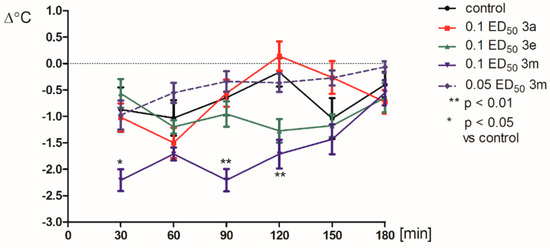 Effect of compounds 3a, 3e and 3m on the body temperature of mice is shown in Figure 2 Two-way ANOVA revealed statistically significant effects of the compounds (F(4,243 = 22.55; p < 0.0001) and time (F(5,243) = 5.92; p < 0.0001) as well as a statistically significant dose x time (F(20,243) = 2.81; p < 0.0001). Bonferroni’s post hoc test confirmed a significant decrease in the body temperature of mice after the administration of compound 3m at the dose of 0.1 ED50 in 30 (p < 0.05), 90 and 120 (p < 0.01) min; * p < 0.05 vs control; ** p < 0.01 vs control.