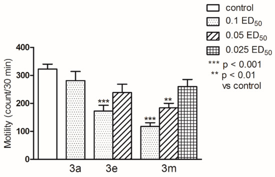 Effect of compounds 3a, 3e and 3m on the spontaneous locomotor activity of mice is given in Figure 3. One-way ANOVA showed significant changes in locomotor activity of mice (F(6,63) = 9.467; p < 0.0001). Dunnett’s post hoc test confirmed a significant reduction in motility of mice after the administration of tested compound 3e at the dose of 0.1 ED50; (p < 0.001) and 3m at the dose of 0.1 ED50 (p < 0.001) and 0.05 ED50 (p < 0.01); ** p < 0.01 vs control; *** p < 0.001 vs control.