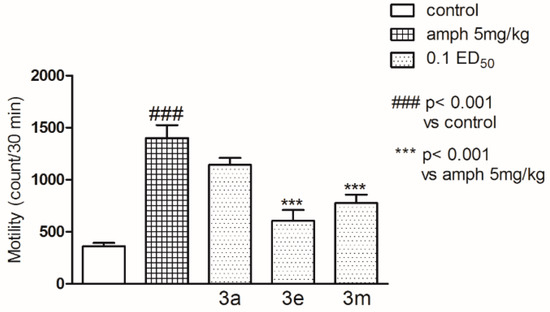 Effect of compounds 3a, 3e and 3m on the amphetamine-induced hyperactivity of mice is presented in Figure 4. One-way ANOVA showed significant changes in locomotor activity of mice (F(4,43) = 20.32; p < 0.0001). Dunnett’s post hoc test confirmed a significant decrease in motility of mice after the concomitant administration of the compound 3e and 3m (p < 0.001) with amphetamine 5 mg/kg at the dose of 0.1 ED50 vs amphetamine-treated group ### p < 0.01 vs control; *** p < 0.001 vs amph 5mg/kg.