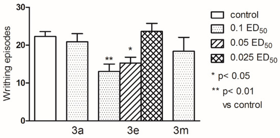 Strong impact on the behaviour of mice in this test was observed for compound 3e, which administered both in higher dose (0.1 ED50) and at twice less dose (0.05 ED50) caused very clear and statistically significant (respectively p < 0.01 and p < 0.05) reduction in the number of writhing episodes in mice (Figure 7).