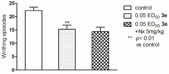 The effect of Nx on the antinociceptive effects of compound 3e assessed in the “writhing” test in mice. One-way ANOVA showed significant changes in the number of writhing episodes of mice after the administration of compounds 3e and co-administration of Nx with this compound (F(2,39) = 8.507; p < 0.001). Post hoc Dunnett’s test showed a significant reduction in the writhing episodes of mice after the administration of the compound 3e at the dose of 0.05 ED50 (p < 0.001). Pretreatment with naloxone did not affect the number of writhing episodes as compared to the compound 3e alone, ** p < 0.01 vs control.