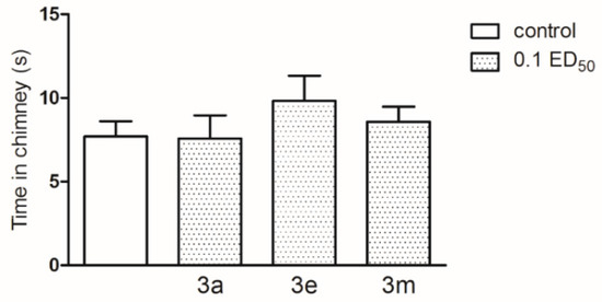 It is worth noting that none of the compounds caused coordination impairments and myorelaxation as measured in the rota-rod and chimney tests (Figure 9 and Figure 10). Effects of the tested compounds on motor coordination evaluated in chimney (Figure 9) and rota-rod test (Figure 10). There were no significant changes in motor coordination of mice in both tests.