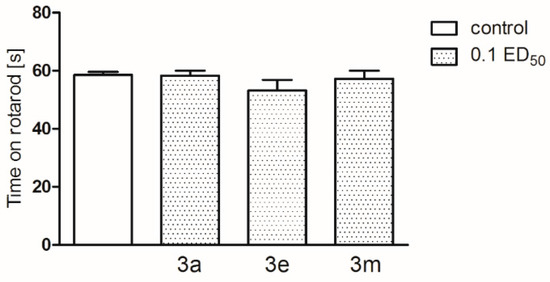The effect of compounds 3a, 3e and 3m on coordination impairment as measured in rota-rod test.