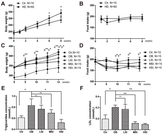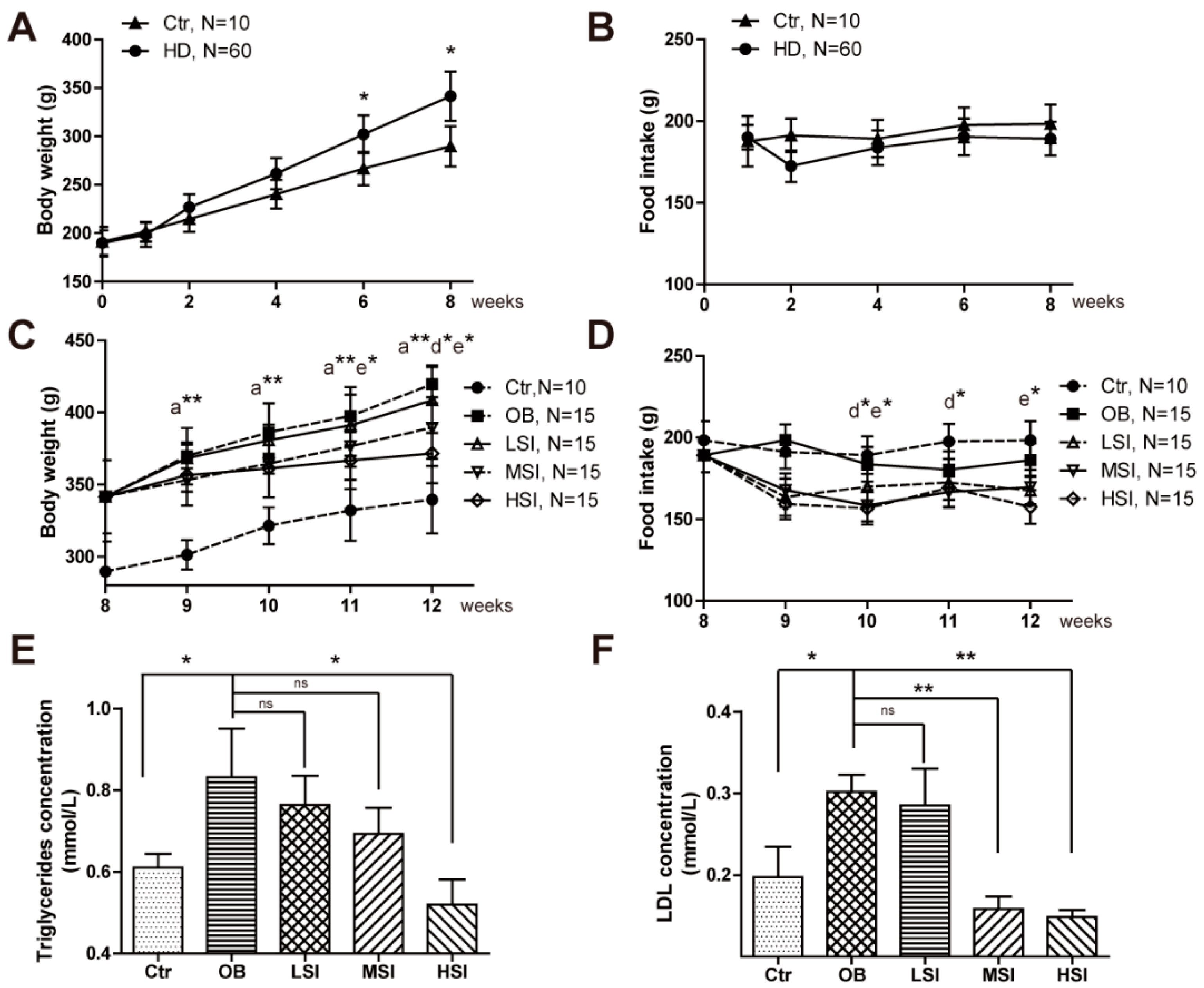 Figure 1. Soy isoflavones reduce the body weight, as well as the plasma TG and LDL concentrations. (A) Quantification shows the body weight of rats feed with basal diets and high fat diets; (B) Quantification shows no difference in food intake of rats feed with basal diets and high fat diets; (C) Quantification shows the body weight trend of DIO rats feed with basal diets and the addition with different doses of soy isoflavones. a**: b vs. a, p < 0.01; d*: b vs. d, p < 0.05; e*: b vs. e, p < 0.05; (D) Quantification shows the food intake trend of DIO rats feed with basal diets and the addition with different doses of soy isoflavones. d*: a vs. d, p < 0.05; e*: a vs. e, p < 0.05; (E) Quantification shows the triglycerides concentration of DIO rats feed with basal diets and the addition with different doses of soy isoflavones; (F) Quantification shows the LDL concentration of DIO rats feed with basal diets and the addition with different doses of soy isoflavones. Error bars indicate SEM. Significant difference in: a control group, b obesity group, c low-dose soy isoflavones group, d middle-dose soy isoflavones group, e high-dose soy isoflavones group. ns, no statistical significance, * p < 0.05, ** p < 0.01.