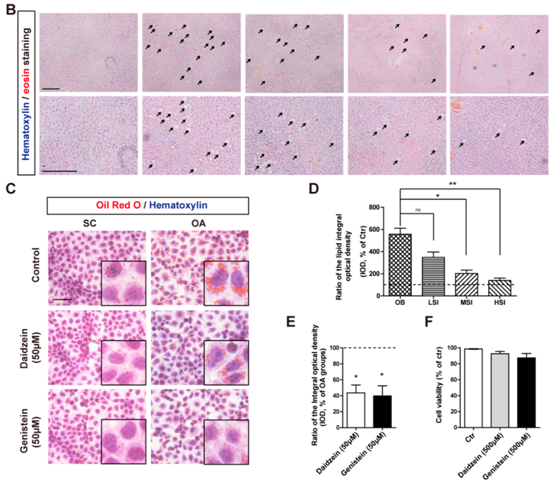 Figure 2. Soy isoflavones suppress the lipid accumulation in vivo and in vitro. (A) Representative images of Oil Red O staining show the accumulation lipid in the liver of rats feed with different diets. The insets show enlarged lipid droplets. Bar: 50 μm; (B) Representative images of H and E staining show the steatosis (arrow indicated) in the liver of rats feed with different diets. Bar: 100 μm; (C) Representative images of Oil Red O staining show the accumulation lipid, induce by 1 mM OA for 24 h, following a 24 h daidzein and genistein treatment in HepG2 cells. SC, solvent control; OA, oleic acid. The insets show enlarged lipid droplets. Bar: 50 μm; (D) Quantification shows a significant decrease in the ratio of the lipid integral optical density between OB groups and soy isoflavone-addition groups. The dashed shows the ctr; (E) Quantification shows a significant decrease in the ratio of the lipid integral optical density in daidzein- and genistein-treated HepG2 cells. * p < 0.05, ** p < 0.01; (F) Quantification shows the cell viability of HepG2 cells treated with daidzein and genistein. Error bars indicate SEM. n = 3.