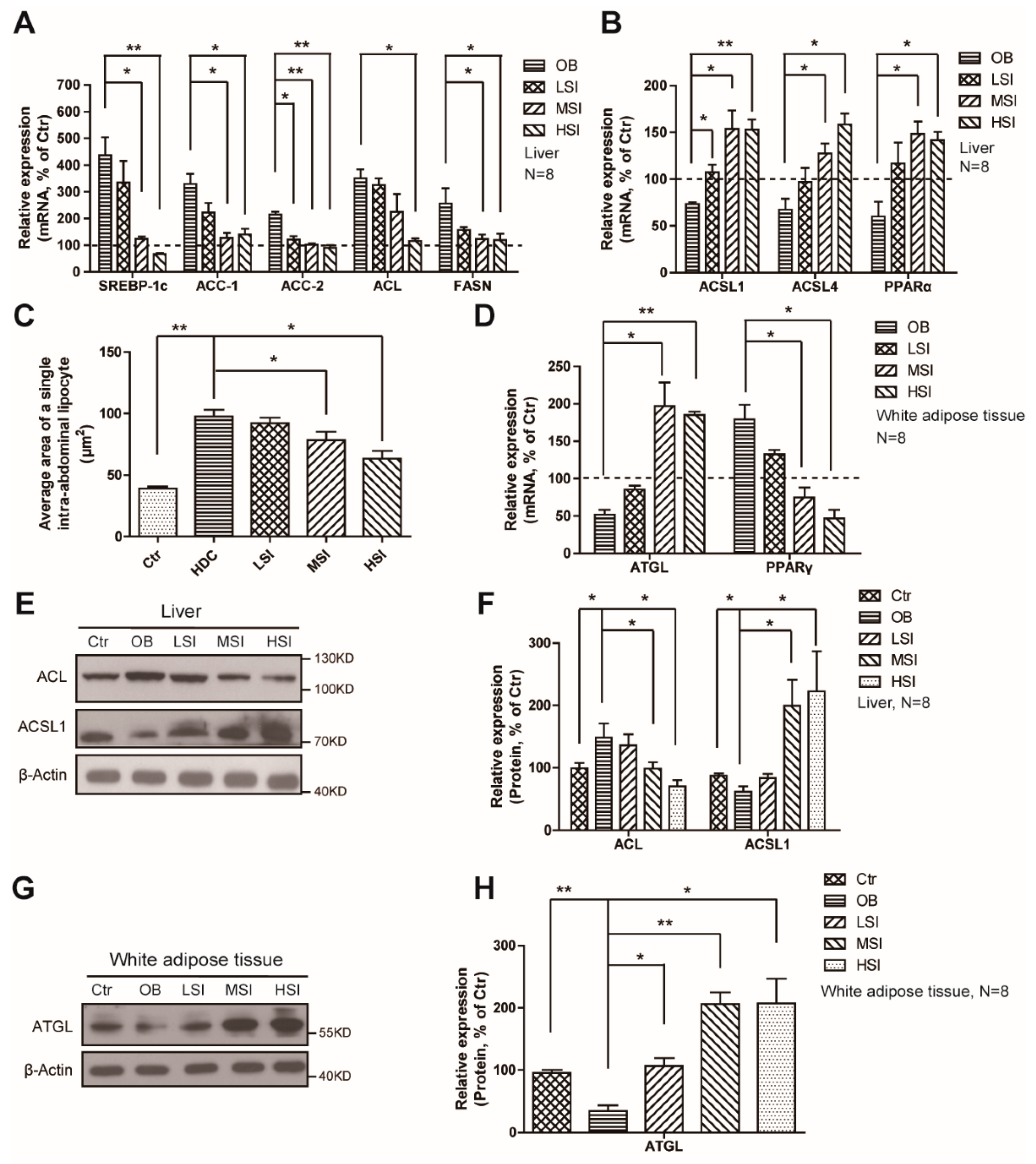 Figure 3. Soy isoflavones suppress lipogenesis and adipogenesis, and enhance lipolysis and β‑oxidation in DIO rats. (A) qRT-PCR shows decreased mRNA levels of the lipogenesis-related genes as indicated in liver of the soy isoflavone-fed DIO rats in comparison to the OB group; (B) qRT-PCR shows increased mRNA levels of the β‑oxidation related genes as indicated in liver of the soy isoflavone-fed DIO rats in comparison to OB group; (C) Quantification shows changes of the average area of a single intra-abdominal lipocyte in rats fed different diets; (D) qRT-PCR shows increased mRNA levels of ATGL, while a decreased mRNA levels of PPARγ, as indicated in white adipose tissue of the soy isoflavone-fed DIO rats in comparison to the OB groups; (E,F) Western blots and quantification show an increase in ACL, and a decrease in ACSL1 in the liver of the soy isoflavone- fed DIO rats in comparison to the OB group; (G,H) Western blots and quantification show an increase in ATGL in the liver of the soy isoflavone-fed DIO rats in comparison to the OB group. Error bars indicate SEM. * p < 0.05, ** p < 0.01. The dashed shows the ctr.