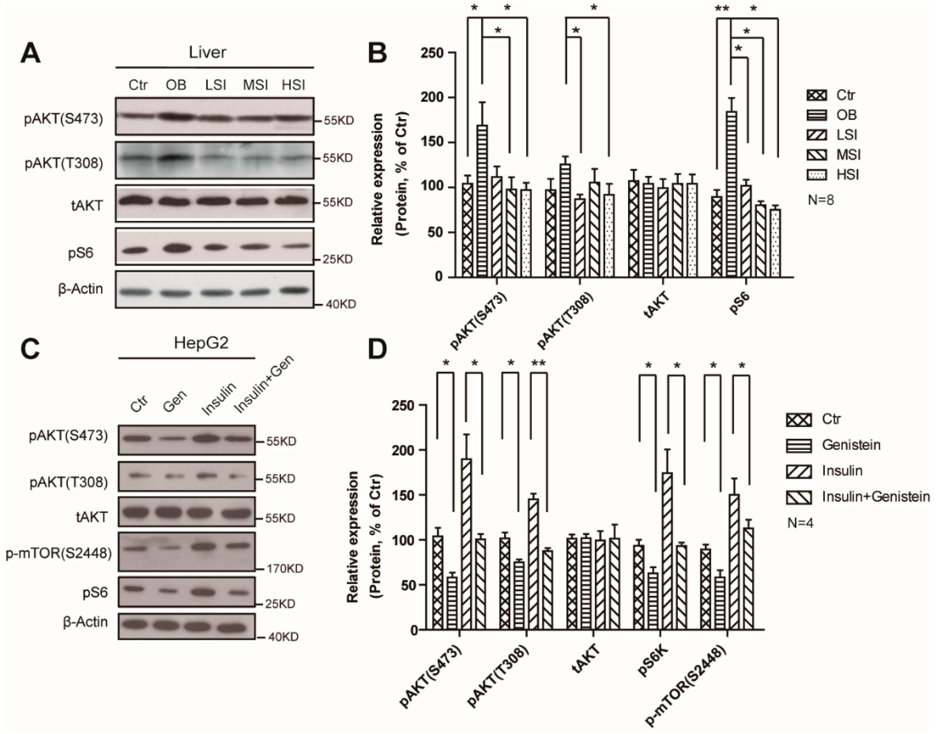 Figure 4. Soy isoflavones suppress the mTORC1 activity via AKT pathway. (A,B) Western blots and quantification show a suppression function of soy isolflavones on mTORC1 activity in DIO rats; (C,D) Western blots and quantification show a suppression function of soy isoflavones on mTORC1 activity in HepG2 cells. Error bars indicate SEM. * p< 0.05, ** p < 0.01.