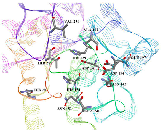 | 59 | 5.204 | −7, −4.88, −5.59, −32.81 | Asn143(H), Glu197(H), Thr257(A), His139(A) | −6.7, −5.61, −4.44, −32.44 |