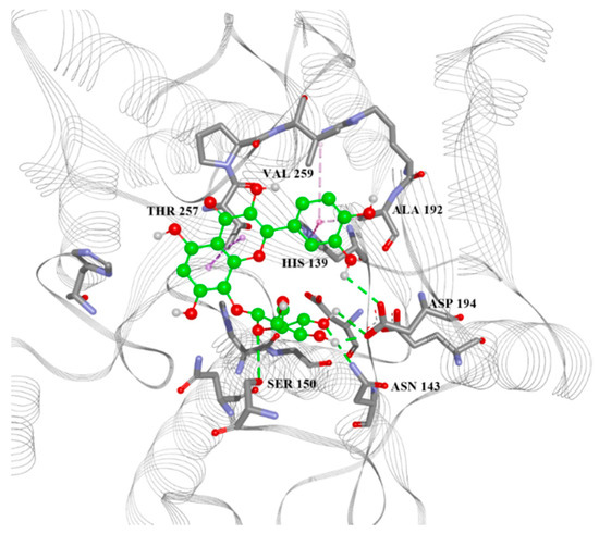 | 38 | 5.054 | −7.0, −5.14, −4.01, −35.12 | Asp141(H), Asn152(H), Thr257(A), Asp194(H) | −6.9, −5.35, −4.60, −38.47 |
